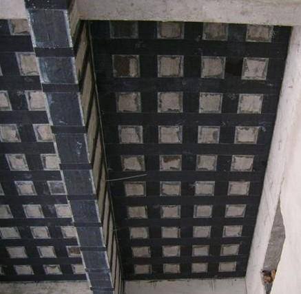新做混泥土混凝土樓板、梁施工結(jié)束并拆卸模版后,按工程圖紙規(guī)定開展板、柱的碳纖維布結(jié)構(gòu)加固。